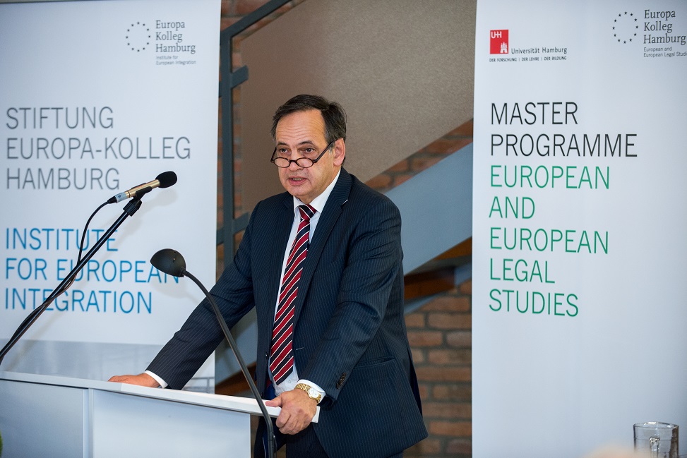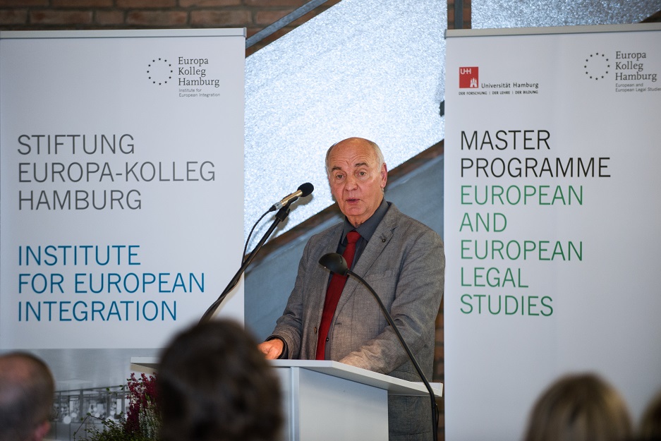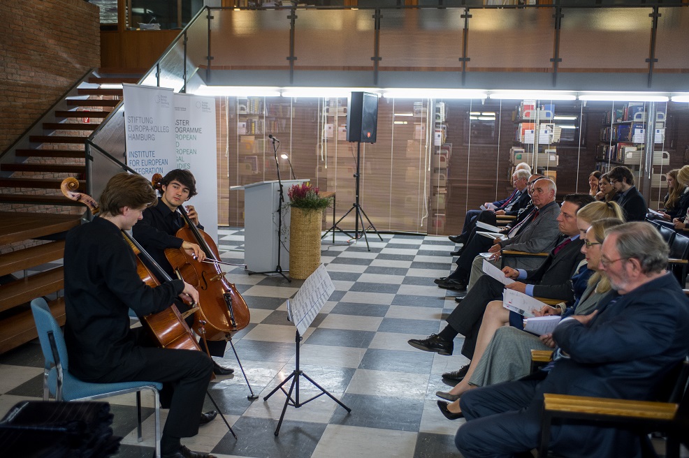 Musikalisch wurde die Feierlichkeit von den Violoncellisten Philip Wentrup und Jakob Schall begleitet. Neben den Eröffnungsreden von Dr. Dr. h.c. Jürgen Lüthje, Präsident der Stiftung Europa-Kolleg Hamburg, Prof. Dr. Markus Kotzur, LL.M. (Duke), Studiengangsleiter des Europa – Kollegs, und Prof. Dr. Bruha, ehemaliger Direktor des Europa – Kolleg, hielt Knut Fleckenstein, MdEP, einen Festvortrag zum Thema „State of the Union – the New European Commission in Perspective“.