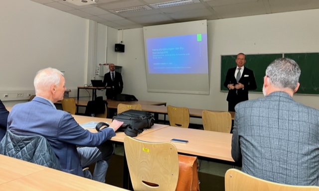 An dem vom Europa-Kolleg Hamburg und der Universität Hamburg organisierten Vortrag von Prof. Dr. Christoph Herrmann nahmen mehr als 20 Gäste teil. Prof. Dr. Christoph Herrmann von der Universität Passau referierte zum Thema „„Herausforderungen der EU-Handelspolitik zwischen Open Strategic Autonomy und Green Deal“. (Link zu vorherigem Beitrag)