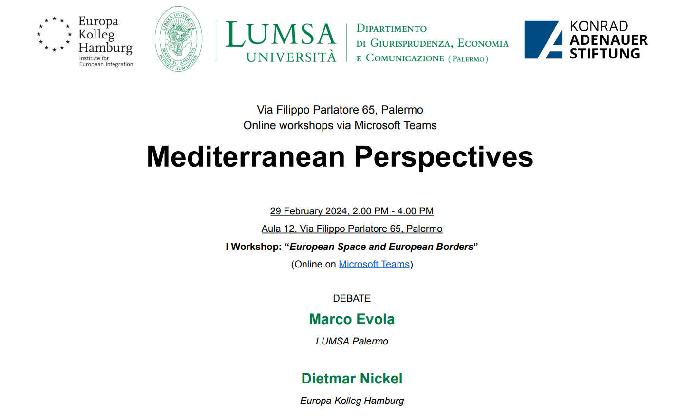 Das Europa-Kolleg Hamburg startet in eine Reihe von Online-Workshops in Kooperation mit der Konrad Adenauer Stiftung und der LUMSA Universität Palermo mit dem Titel „Mediterranean Perspectives“. In den drei Terminen werden die Themen Raum, Souveränität und Identität jeweils mit Blick auf die europäische Dimension untersucht und diskutiert.