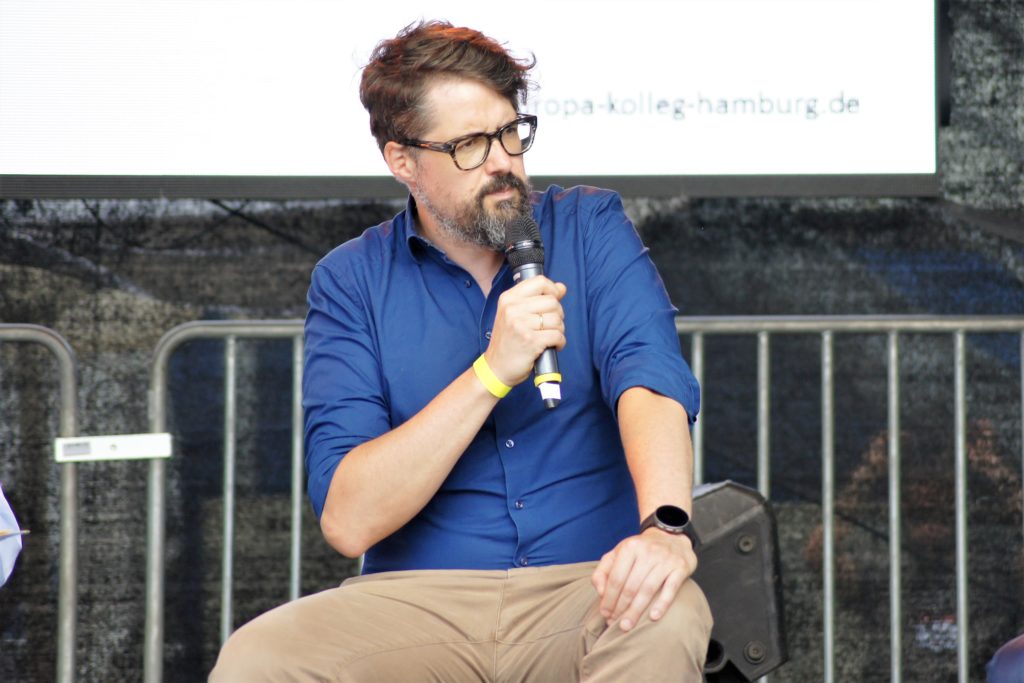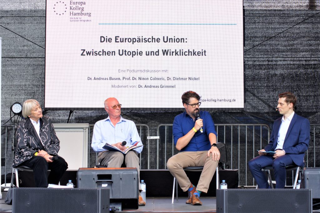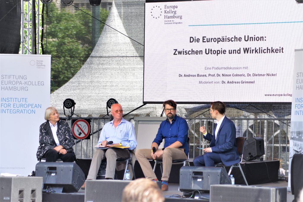 Welche zentralen Entwicklungen und Herausforderungen prägen die EU heute? Welche Kontinuitäten und Brüche lassen sich im bisherigen Prozess der Integration erkennen und was bedeutet dies für die Zukunft des Integrationsprojekts? Und warum ist es der EU – ihren Institutionen und Mitgliedstaaten – bislang nur unzureichend gelungen, Lösungen für die sich stellenden Probleme zu finden? Diese Fragen habe die Forscherinnen und Forscher des Europa-Kolleg Hamburg – Institute for European Integration am Donnerstag, den 20. Juni vor interessiertem Publikum auf dem Hamburger Rathausmarkt im Rahmen des „Sommer des Wissens“, diskutiert.