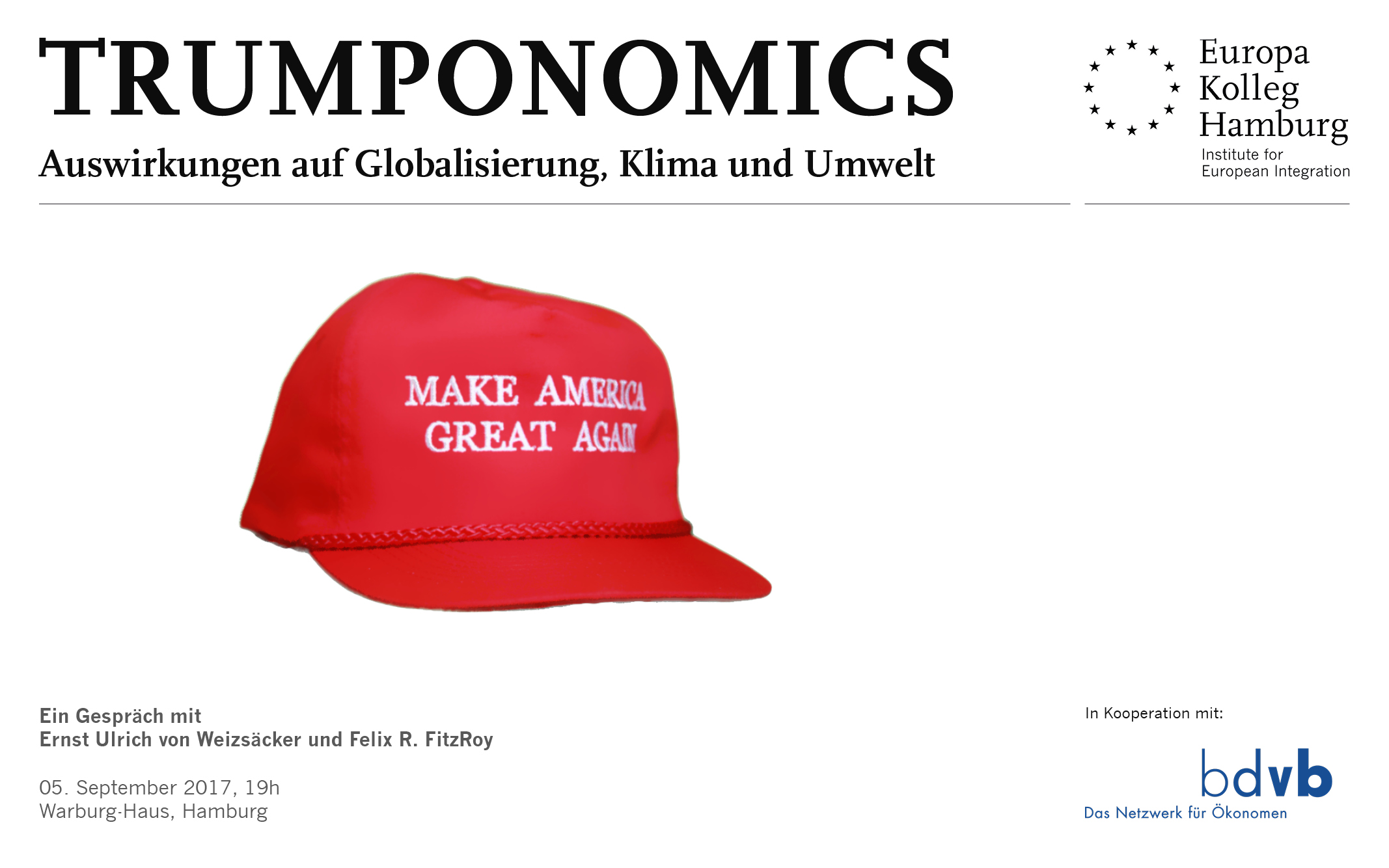 Am Dienstag, den 5. September 2017 veranstaltete das Europa-Kolleg Hamburg in Kooperation mit dem Bundesverband Deutscher Volks- und Betriebswirte im Warburg-Haus die Podiumsdiskussion Trumponomics – Auswirkungen auf Globalisierung, Klima und Umwelt.