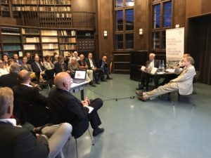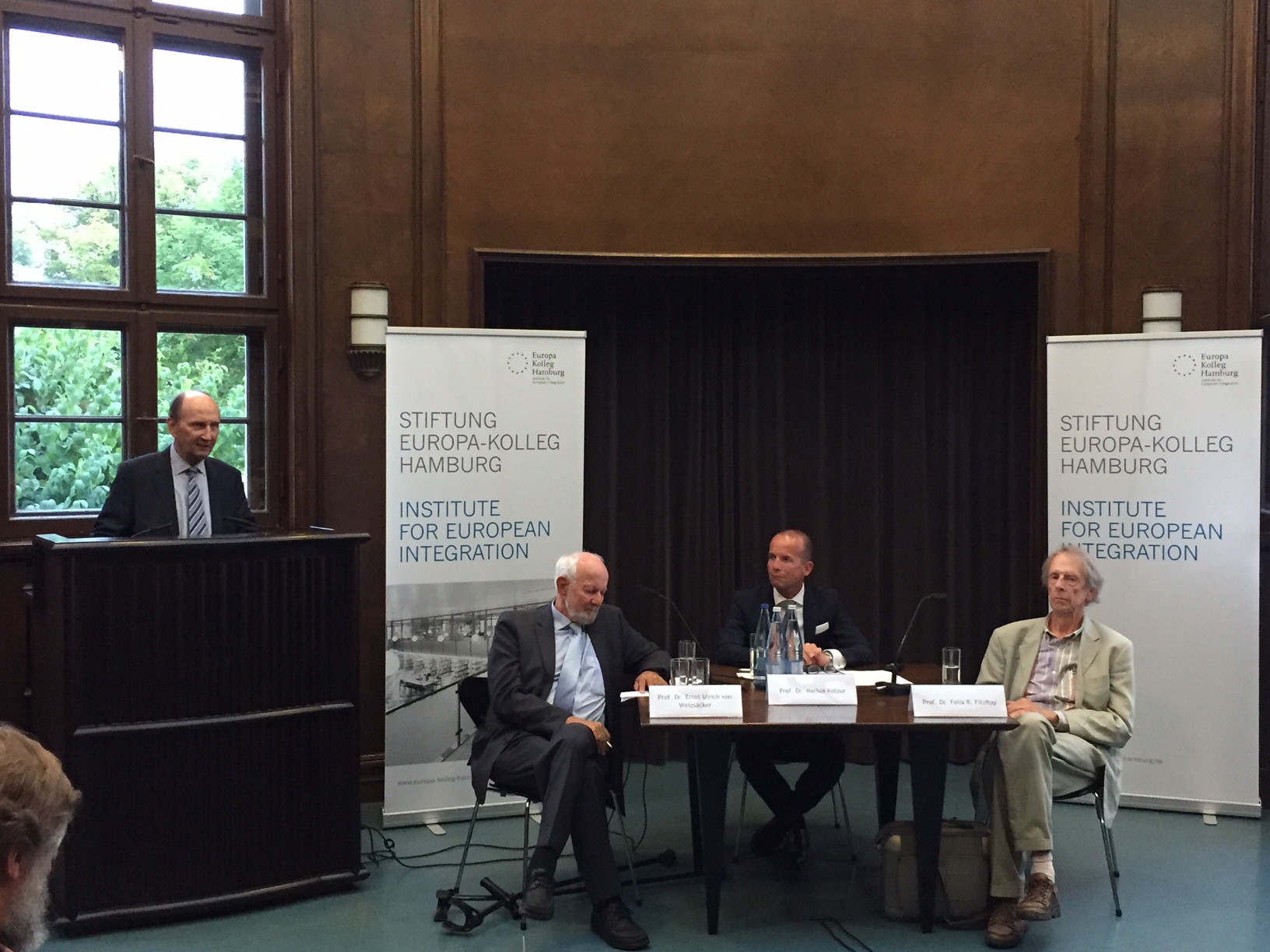 Nach kurzer Begrüßung durch Dr. Konrad Lammers, Forschungsdirektor des Institute for European Integration am Europa-Kolleg Hamburg, hieß Dr. Jürgen Monzel, Vorsitzender der Bezirksgruppe Hamburg/Schleswig Holstein das zahlreich erschiene Publikum im Namen des bdvb willkommen. Auf unserem Podium haben mit Prof. Dr. Ernst Ulrich von Weizsäcker, Ko-Präsident des Club of Rome, und Prof. Dr. Felix R. FitzRoy, University of St. Andrews, zwei ehemalige Kollegiaten des Europa-Kolleg Hamburgs die globalen Auswirkungen einer vornehmlich auf nationalen Eigennutz ausgerichteten Wirtschaftspolitik der Regierung von Donald Trump diskutiert.